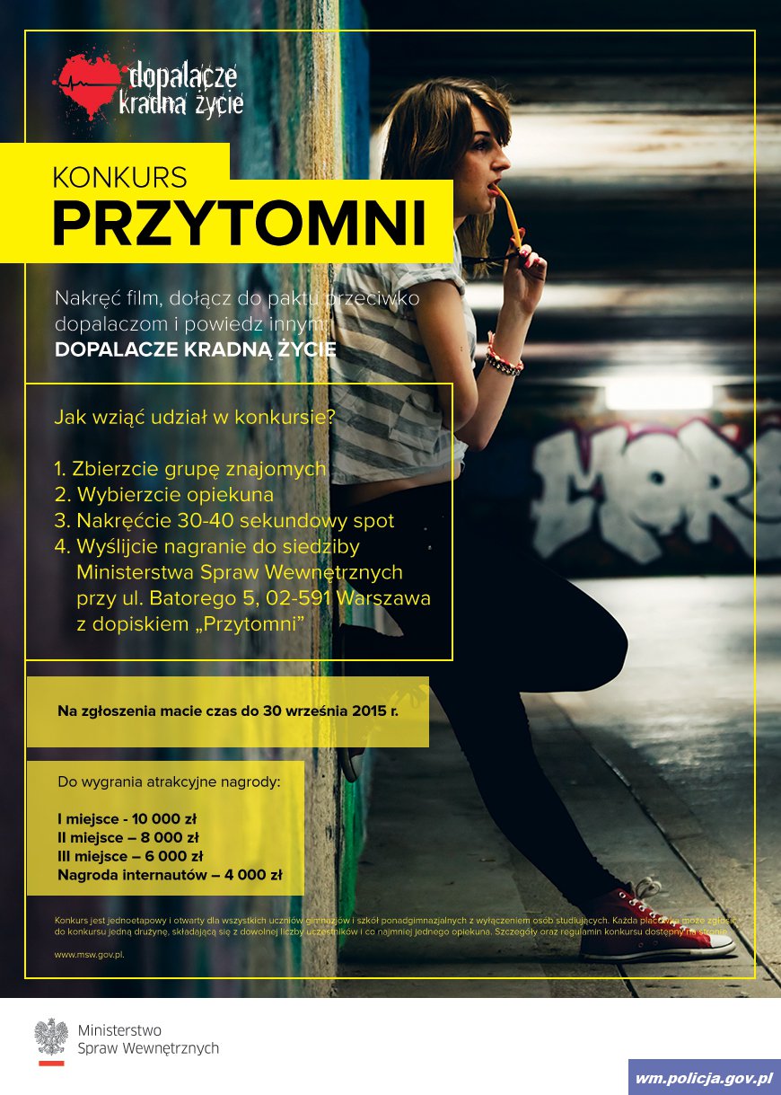 Nakręć spot, powiedz wszystkim, że „Dopalacze kradną życie” i wygraj dla swojej szkoły atrakcyjne nagrody! Ministerstwo Spraw Wewnętrznych ogłasza konkurs dla uczniów szkół gimnazjalnych oraz ponadgimnazjalnych na najlepszy materiał filmowy promujący zdrowy i wolny od używek (przede wszystkim od dopalaczy) tryb życia. Celem akcji „Przytomni” jest zwiększenie świadomości młodych osób, w zakresie niebezpieczeństw związanych z zażywaniem dopalaczy. Konkurs jest częścią rozpoczętej w lipcu kampanii społecznej „Dopalacze Kradną Życie”.