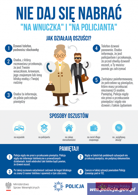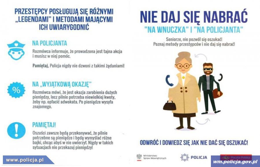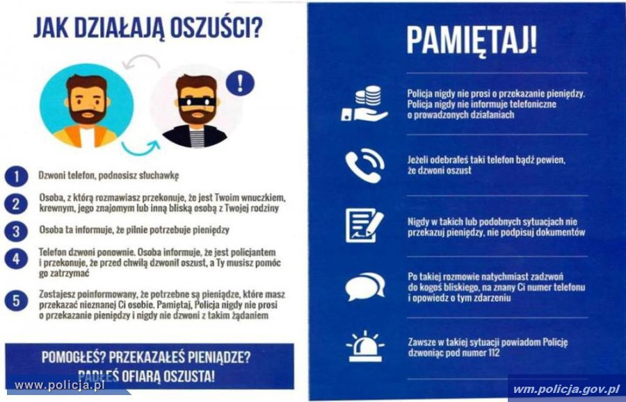 Oszuści podszywając się za członka rodziny wciąż próbują oszukać starszych ludzi i wyłudzić pieniądze. Coraz częściej członkowie grup przestępczych podają się za funkcjonariuszy policji zajmujących się rozpracowywaniem oszustów. Bądźmy ostrożni! Nie dajmy się zwieść! Prawdziwi policjanci NIGDY nie informują o prowadzonych przez siebie sprawach telefonicznie i NIGDY nie proszą o przekazanie pieniędzy.
