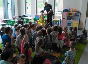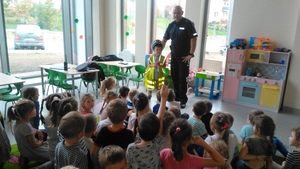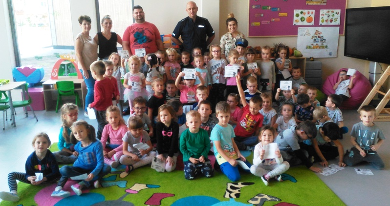 Ważnym elementem tego spotkania było przede wszystkim bezpieczeństwo w ruchu drogowym. Dzieci aktywnie uczestniczyły w rozmowie i chętnie odpowiadały na zadawane pytania. Wiedziały jak ważne jest korzystanie z fotelików bezpieczeństwa i zapinanie pasów podczas jazdy. Znały zasady, jak bezpiecznie poruszać się po drodze, wiedziały co to jest sygnalizacja świetlna i komu służy.