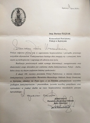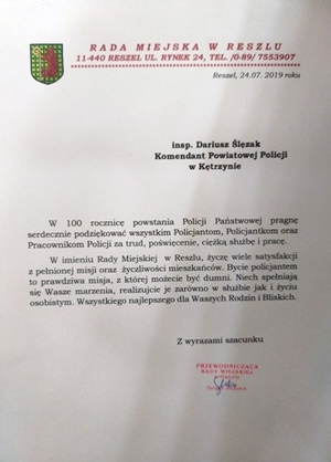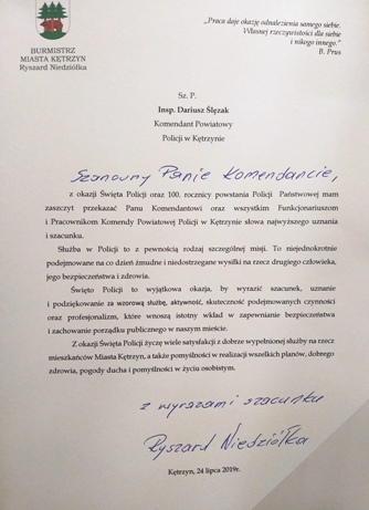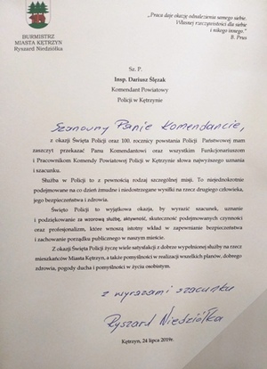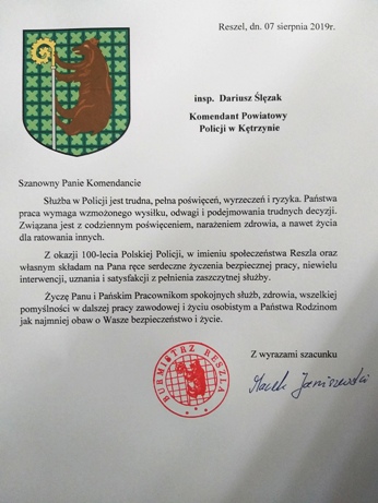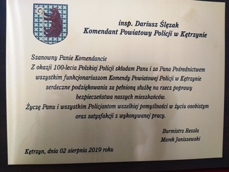 Burmistrz Miasta Kętrzyn Ryszard Niedziółka, Burmistrz Reszla Marek Janiszewski oraz Rada Miejska w Reszlu, Komendant Warmińsko-Mazurskiego Oddziału Straży Granicznej w Kętrzynie płk SG Robert Inglot, Dyrektor Okręgowy Służby Więziennej w Olsztynie płk Elżbieta Jankowska oraz Komendant Centrum Szkolenia Straży Granicznej płk SG Adam Pacuk z okazji Święta Policji, w 100. rocznicę powołania Policji Państwowej życzą wszystkim Funkcjonariuszom oraz Pracownikom Komendy Powiatowej Policji w Kętrzynie wszelkiej pomyślności, wielu sukcesów i nieustającej satysfakcji z codziennej służby i pracy, dziękują za wszelki trud i poświęcenie dla wspólnego dobra, jakim jest bezpieczeństwo mieszkańców naszego Powiatu.