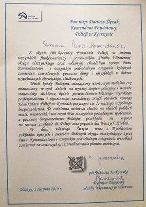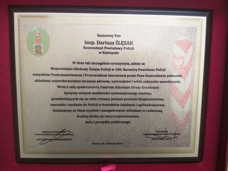 Życzenia od Burmistrza Miasta Kętrzyn, Burmistrza Reszla i Rady Miejskiej w Reszlu, funkcjonariuszy i pracowników - Służby Więziennej w Olsztynie, Warmińsko-Mazurskiego Oddziału Straży Granicznej w Kętrzynie oraz całej społeczności Centrum Szkolenia Straży Granicznej w Kętrzynie z okazji Święta Policji w 100. rocznicę powołania Policji Państwowej