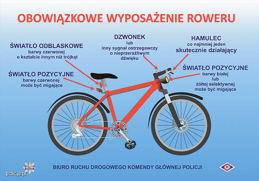 Dalej wspomnieć należy o obowiązkowym wyposażeniu roweru, a także o wyposażeniu które nie wynika wprost z przepisów, ale znacząco wpływa na poprawę bezpieczeństwa. Wszystkim, którzy nie wiedzą, czy ich rower spełnia normy określone w przepisach, z pomocą przychodzi Rozporządzenie Ministra Infrastruktury z dnia 31 grudnia 2002 r. w sprawie warunków technicznych pojazdów oraz zakresu ich niezbędnego wyposażenia. Zgodnie z § 53 ust. 1 Rozporządzenia, rower powinien być wyposażony w: 1) z przodu – co najmniej w jedno światło pozycyjne barwy białej lub żółtej selektywnej; 2) z tyłu – co najmniej w jedno światło odblaskowe barwy czerwonej o kształcie innym niż trójkąt oraz co najmniej w jedno światło pozycyjne barwy czerwonej; 3) w światła, o których mowa w ust. 3 pkt 3, jeżeli konstrukcja roweru lub wózka rowerowego uniemożliwia kierującemu sygnalizowanie przez wyciągnięcie ręki zamiaru zmiany kierunku jazdy lub pasa ruchu; 4) co najmniej w jeden skutecznie działający hamulec; 5) w dzwonek lub inny sygnał ostrzegawczy o nieprzeraźliwym dźwięku.
