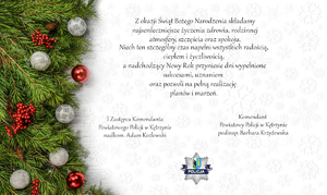 Tak to już jest, że gdy jedni będą świętować i spędzać czas z bliskimi, drudzy, a wśród nich wielu policjantów, będzie pełniło służbę na rzecz bezpieczeństwa tych pierwszych. Pomagamy i chronimy przez cały rok! Pamiętajmy, że bezpieczeństwo to nasza wspólna sprawa i wszyscy mamy na nie wpływ. Dlatego zadbajmy o to, by powodów do policyjnych interwencji było jak najmniej, a o wszelkich niepokojących zjawiskach i zdarzeniach informujmy odpowiednie służby. Niech to będą spokojne i bezpieczne święta!